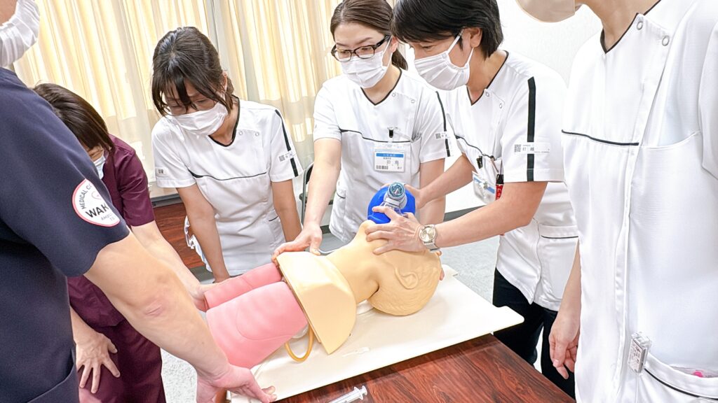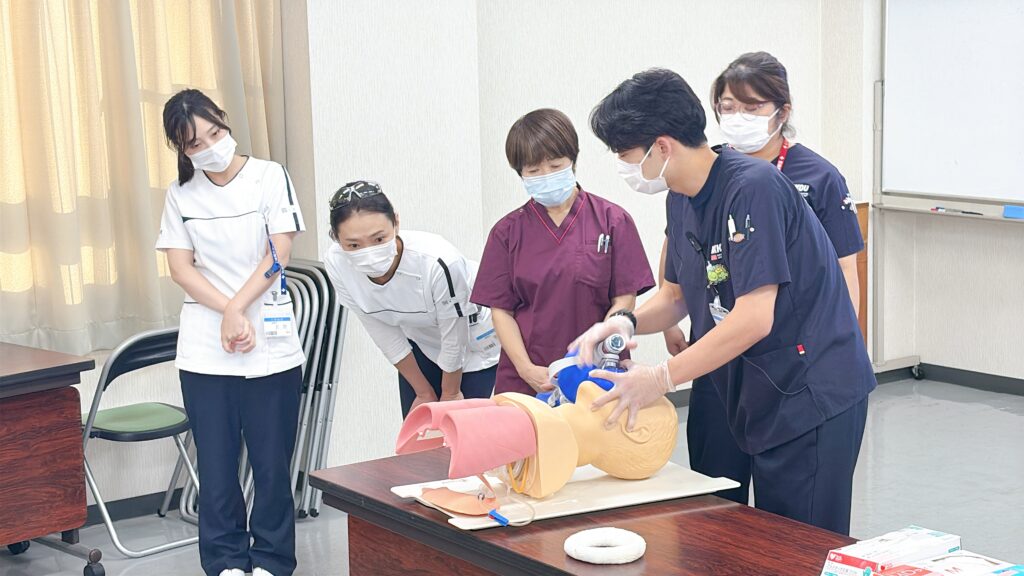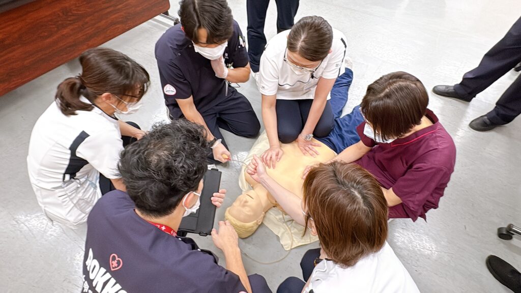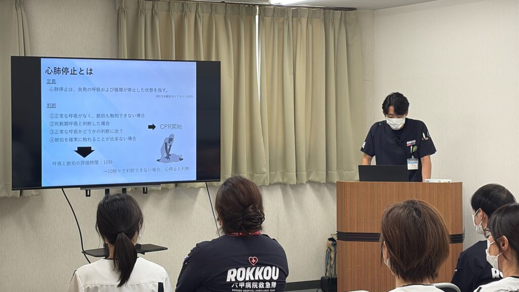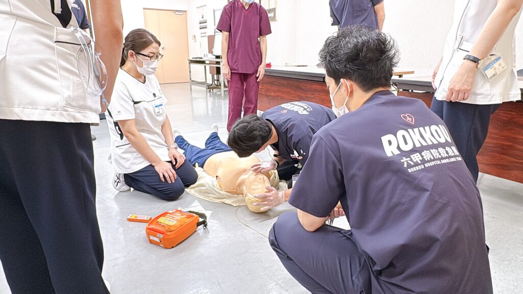 六甲病院救急隊長が心肺停止患者(CPA)の救命処置を医師・看護師・事務員に救急現場を想定し研修しました。医師の視点、看護師・救命士の視点とさまざまな角度から意見が飛び交う勉強会となりました。
